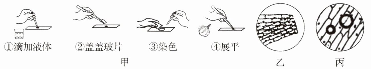 8. 小敏进行了“制作并观察洋葱鳞片叶内表皮细胞临时装片”的实验,图甲是实验的部分操作步骤示意图,图乙和图丙是显微镜下观察到的不同物像。请据图回答下列问题。