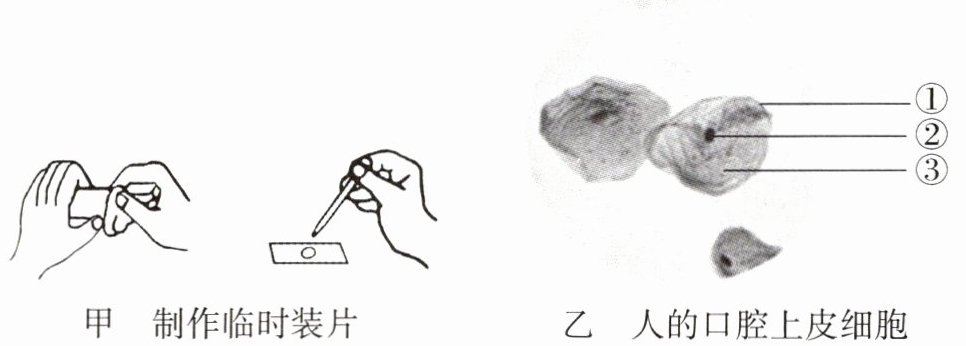 9. 细胞是构成生物体的基本单位,我们对细胞进行观察时,需制作临时装片。图甲为制作人的口腔上皮细胞临时装片的部分过程示意图,图乙为观察结果。请据图回答下列问题。