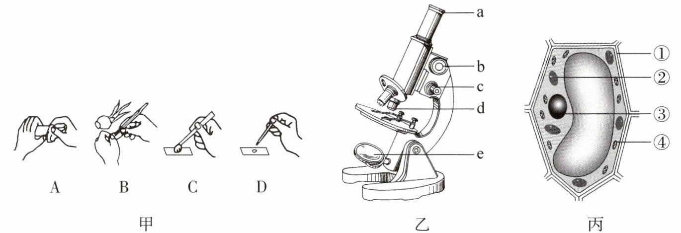 7. (湖南益阳中考)细胞是构成生物体的基本单位。我们对细胞进行观察时,需制作玻片标本并借助显微镜观察。图甲为制作临时装片的部分过程示意图,图乙为显微镜构造图,图丙为植物细胞结构示意图。请据图回答下列问题。