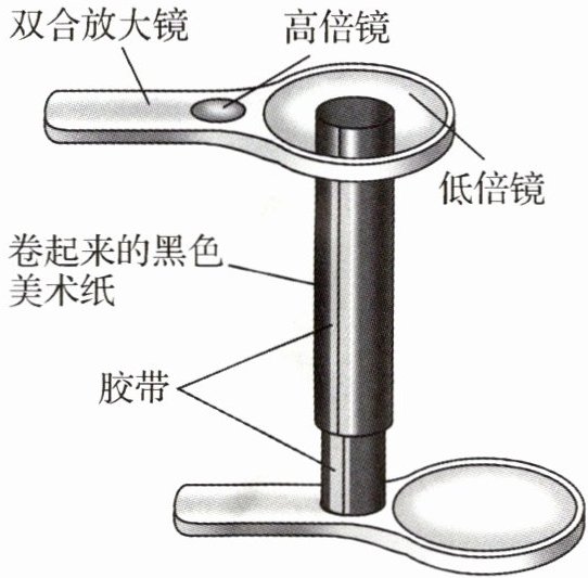 2 个双合放大镜(每个放大镜都带有两种镜片,其中一种为高倍镜,另一种为低倍镜)、直尺、2 根用黑色美术纸卷成的管子、胶带、书本。