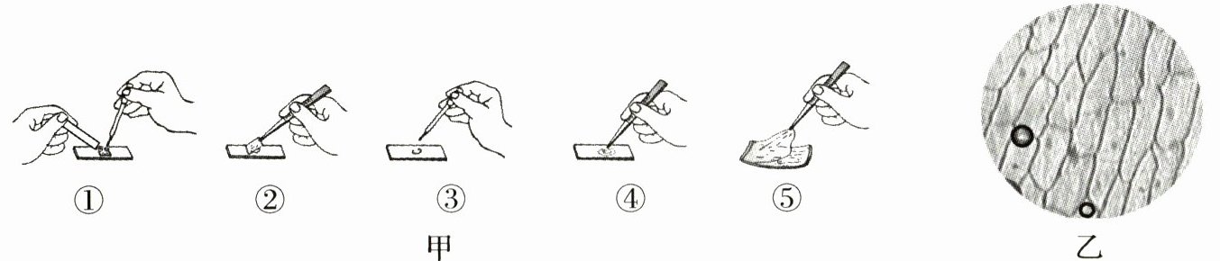 13. 图甲表示洋葱鳞片叶内表皮细胞临时装片制作时的某些步骤;图乙表示用显微镜观察该临时装片时的视野。请据图回答下列问题。