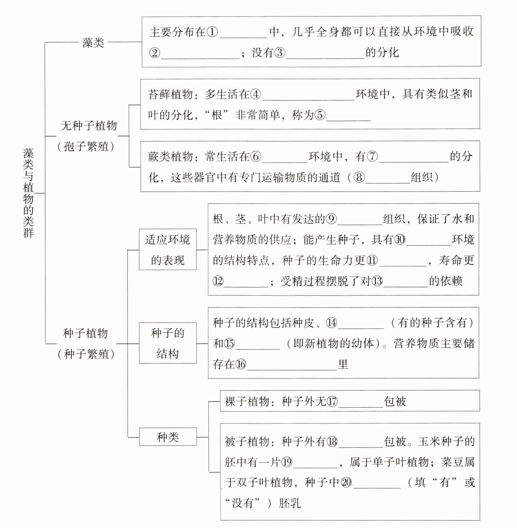 ①水 ②水和无机盐 ③根、茎、叶 ④陆地上的阴湿 ⑤假根 ⑥阴湿 ⑦根、茎、叶 ⑧输导 ⑨输导 ⑩适应 ⑪强 ⑫长 ⑬水环境 ⑭胚乳 ⑮胚 ⑯子叶或胚乳 ⑰果皮 ⑱果皮 ⑲子叶 ⑳没有