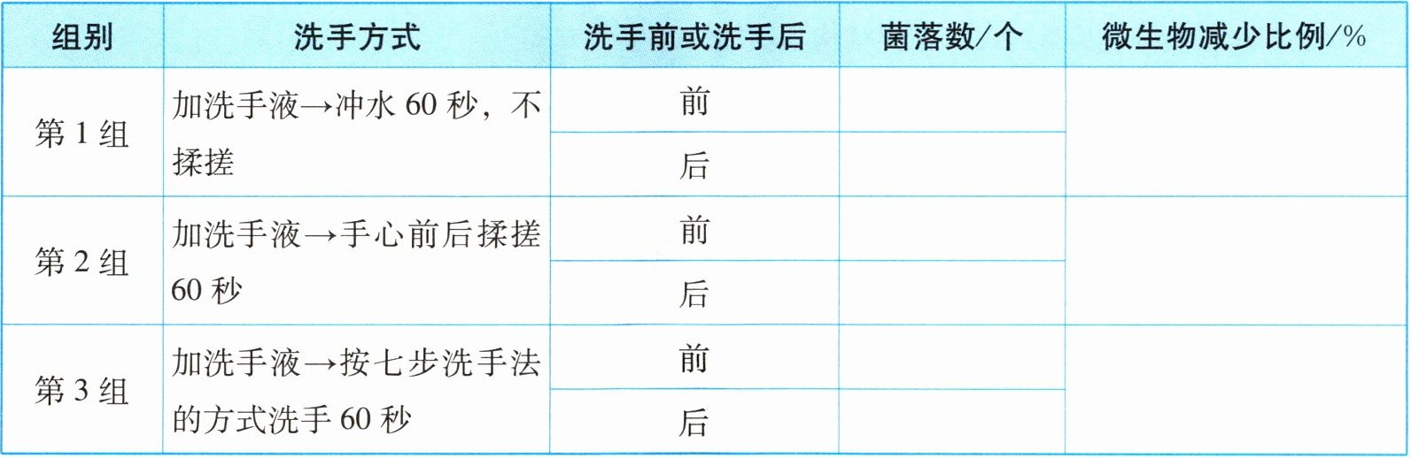 (4)提示:按实际观察情况填写观察记录单。(5)①培养皿和培养基在接种前必须高温灭菌,目的是避免培养时有其他杂菌产生,影响实验结果。②培养皿的大小、洗手液的种类和使用量应相同。③户外运动后、吃饭前等应该仔细洗手,避免微生物残留。