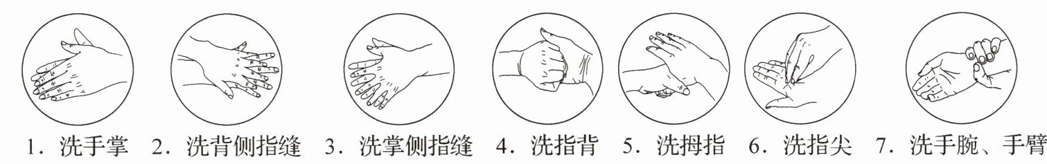 1. 洗手掌 2. 洗背侧指缝 3. 洗掌侧指缝 4. 洗指背 5. 洗拇指 6. 洗指尖 7. 洗手腕、手臂