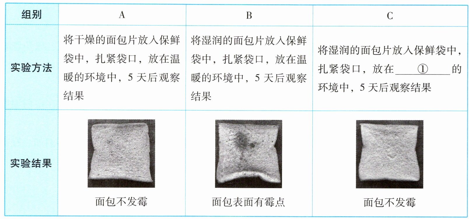 |实验方法|将干燥的面包片放入保鲜袋中,扎紧袋口,放在温暖的环境中,5天后观察结果|将湿润的面包片放入保鲜袋中,扎紧袋口,放在温暖的环境中,5天后观察结果|将湿润的面包片放入保鲜袋中,扎紧袋口,放在______①______的环境中,5天后观察结果|