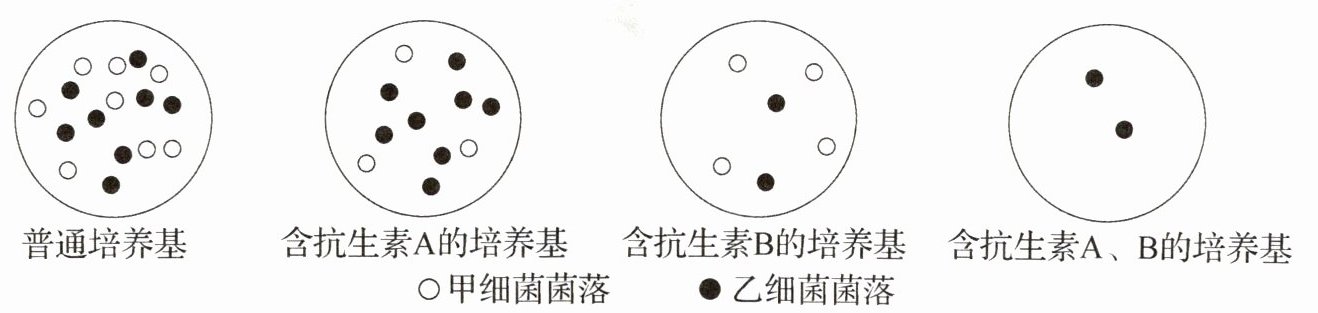 6. 为了研究 A、B 两种抗生素对甲、乙两种细菌的抑制效果,研究人员将两种细菌混合,分别取等量混合液涂抹在不同的培养基上,培养结果如下图所示。下列对该实验的分析,错误的是(