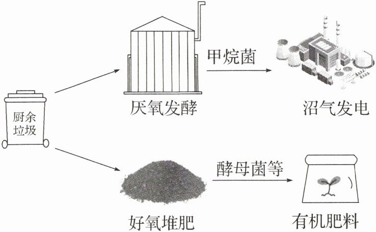 8. 在大街上、社区中,各式各样的垃圾分类标语随处可见。工作人员将分类后的厨余垃圾通过厌氧发酵或好氧堆肥处理,实现厨余垃圾的再利用,其原理如下图所示。下列有关叙述错误的是(