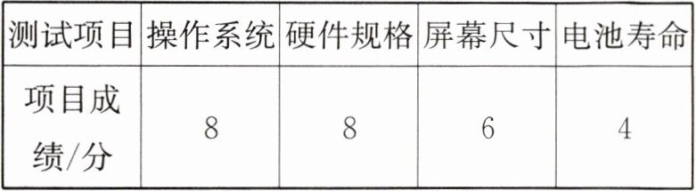 最后将操作系统、硬件规格、屏幕尺寸、电池寿命这四项成绩按 $ 3:3:2:2 $ 的比例计算综合成绩,则该手机的综合成绩为