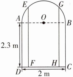 4. 如图,一个洞口的上方是以 AB 为直径的半圆,下方是长方形,已知$AD = 2.3m,CD = 2m$,为保证安全,现要竖立两根长度相等的支柱 EF 和 GH(支柱与地面垂直),使支柱的顶端 E,G 在半圆上.若两根支柱间的距离 FH 为 1.6 m,则两根支柱的高度 EF(或 GH)为