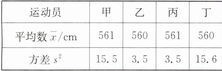 3. 下表记录了甲、乙、丙、丁四名跳远运动员选拔赛成绩的平均数$\overline {x}$(单位:cm)与方差$s^{2}$.根据表中数据,要从中选择一名成绩好,又发挥稳定的运动员参加比赛,应该选择(