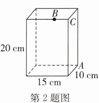 2. 如图,无盖长方体盒子的长为15cm,宽为10cm,高为20cm,若BC=5cm,一只蚂蚁沿着盒子的表面从A点爬到B点,需要爬行的最短路程为
