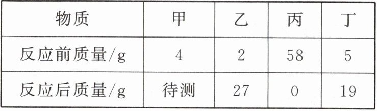 A 解析:反应后丙物质减少了58g,是反应物;乙物质增加了25g,是生成物;丁物质增加了14g,是生成物;根据质量守恒定律可知,甲物质是生成物,生成甲的质量是58g - 25g - 14g = 19g。由分析可知,丙是反应物,甲、乙、丁是生成物,属于分解反应。