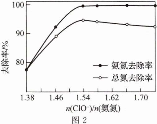 ③n(ClO⁻)/n(氨氮)对废水中氨氮去除率和总氮去除率的影响如图2所示。当n(ClO⁻)/n(氨氮)>1.54后,总氮去除率下降的原因是______。