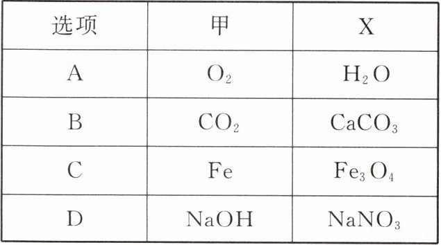 D 解析:若甲是氧气,则乙可以是一氧化碳,丙是二氧化碳,X 是水,则 Y 是氢氧化钙,Z 是碳酸钙,可以一步反应实现,A 项正确;若甲是二氧化碳,则乙可以是氧气,丙是一氧化碳,X 是碳酸钙,Y是氧化钙,Z是氢氧化钙,可以一步反应实现,B项正确;若甲是铁,则乙可以是硫酸亚铁,丙可以是氯化亚铁,X 是四氧化三铁,Y 可以是水,Z 是氧气,可以一步反应实现,C项正确;若甲是氢氧化钠,X是硝酸钠,硝酸钠不能转化生成氢氧化钠,D项错误。