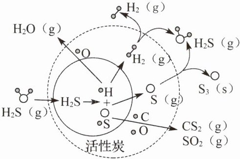 B 解析:分析题给反应机理图是解题的基础,从机理循环图可以看出,进入的物质有$H_{2}S$,导出的物质有$H_{2}O$、$H_{2}$、S、$H_{2}S$、$CS_{2}$、$SO_{2}$,有关变化有:$H_{2}S=2H+S,H_{2}+S=H_{2}S,2S+C=$$CS_{2}$、$2H+O=H_{2}O$、$S+2O=SO_{2}$。结合题给活性碳催化条件下煤气中的$H_{2}S$和 Hg 的协同脱除,脱汞过程反应为$Hg+S=HgS$,整个过程主要反应方程式为$H_{2}S=H_{2}+S$和$Hg+H_{2}S$$=HgS+H_{2}$。$H_{2}S$被吸附在催化剂活性碳表面形成氢原子和硫原子,氢原子结合生成氢分子从催化剂表面脱附产生氢气,A 正确;由图可知,$H_{2}S$分解产生的$H_{2}$和 S 单质会再次生成$H_{2}S$,因此$H_{2}S$脱除率小于100%,B错误;由图可知,$H_{2}S$生成 S 单质的过程中,硫元素化合价升高被氧化,$H_{2}S$生成$H_{2}$的过程中,氢元素化合价降低被还原,C正确;该过程是$H_{2}S$和 Hg 的协同脱除,故生成的硫单质与 Hg 反应生成 HgS,D 正确。因此答案选 B。