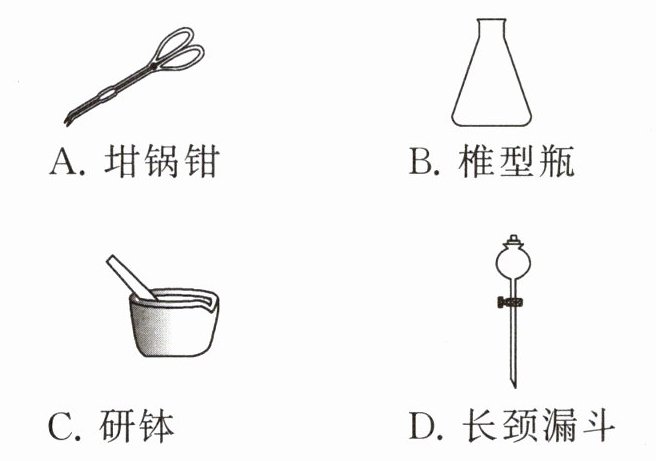 C 解析:A项中仪器为坩埚钳;B项中为锥形瓶;C项中为研钵,D项中为分液漏斗。