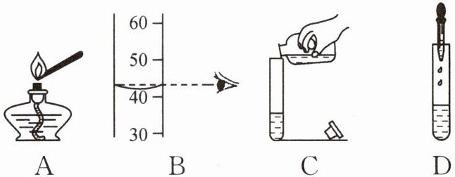 A 解析:使用酒精灯时要注意"两查、两禁、一不可",可用火柴点燃酒精灯,A项图中所示操作正确;量取液体时,视线与液体的凹液面最低处保持水平,图中视线没有与液体的凹液面最低处保持水平,B项操作错误;向试管中倾倒液体药品时,瓶塞要倒放,标签要对准手心,瓶口紧挨;图中试管没有倾斜、瓶塞没有倒放,C项所示操作错误;使用胶头滴管滴加少量液体的操作,注意胶头滴管不能伸入到试管内或接触试管内壁,应垂直悬空在试管口上方滴加液体,防止污染胶头滴管,D项图中所示操作错误。