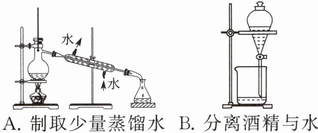 A 解析:用自来水制备少量蒸馏水,用蒸馏烧瓶,温度计位置,冷却水的流向均正确,选项A正确;酒精和水互溶不分层,故不能用分液的方法分离,选项B错误;容量瓶不能直接用于稀释或配制溶液,选项C错误;过滤操作必须用玻璃棒引流,选项D错误。答案选A。