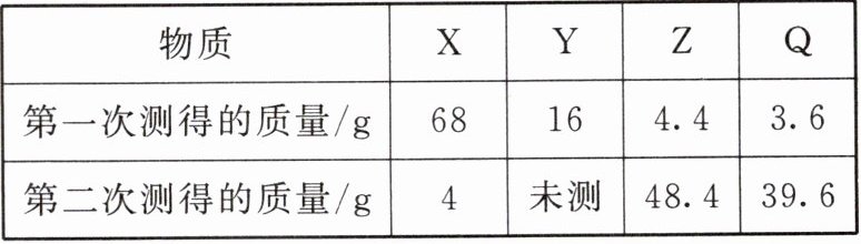 A 解析:由表中数据知X减少64 g,Z增加44 g,Q增加36 g,则Y减少16 g,因此反应质量变化关系如下:X + Y=Z + Q64 g 16 g 44 g 36 g因此反应不是化合反应,A项错误;若X是氧气,反应为氧化反应,B项正确;第二次测量时Y的质量为0 g,C项正确;反应中Z与Q质量变化之比为44:36=11:9,D项正确。