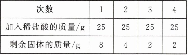 (1)10 g (2)10.5%解析:根据前两次都是固体减少4 g,而第三次只减少2 g,说明此时已经完全反应完毕,说明剩余的固体为杂质,碳酸钙的质量为12 g-2 g=10 g。设生成的氯化钙的质量为x,生成的二氧化碳的质量为y$CaCO_{3}+2HCl=CaCl_{2}+H_{2}O+CO_{2}↑$100 111 4410 g x y$\frac{100}{10g}=\frac{111}{x}=\frac{44}{y}$x=11.1 gy=4.4 g第4次加入稀盐酸后所得溶液中$CaCl_{2}$的质量分数为$\frac{11.1g}{10g+25g×4-4.4g}×100\%≈10.5\%$。