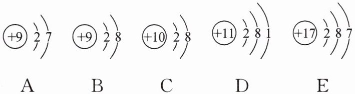 (6)BC 解析:A是氟原子,B是氟离子${F-}$,C是氖原子,D是钠原子,E是氯原子。B和C电子层结构完全相同,均为稳定结构;D是金属元素;氖是稀有气体元素;最外层电子数相同的原子化学性质相似,A和E化学性质相似。