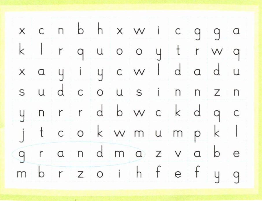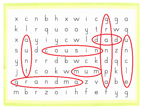 圈出家庭成员类的单词并抄写。(只有横竖两个方向哟!)