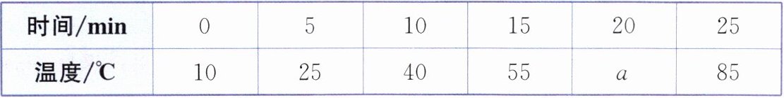 ℃。解析:因为温度的变化是均匀的,所以由表格中的数据可以发现,时间每增加5min,温度升高15℃。因为15min时的温度为55℃,所以在此基础上增加5min即20min时的温度为55 + 15 = 70(℃)。