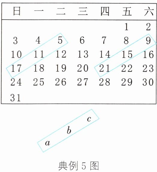 解析:(1)通过观察、比较,发现三个数中相邻两数相差 6,可以设 $ a $,$ b $,$ c $ 这三个数分别为 $ x + 6 $,$ x $,$ x - 6 $,易知 $ (x + 6) + (x - 6) = 2x $,即最大数与最小数的和是中间数的 2 倍,据此可得答案.(2)由(1),可知这三个数的和为 $ (x + 6) + x + (x - 6) = 3x $. 所以可得 $ 3x = 66 $,解得 $ x = 22 $,即 $ b = 22 $.(3)由(2),可得若能,则 $ 3x = 84 $,解得 $ x = 28 $,即 $ b = 28 $. 由月历,可知不能框出 34,28,22.