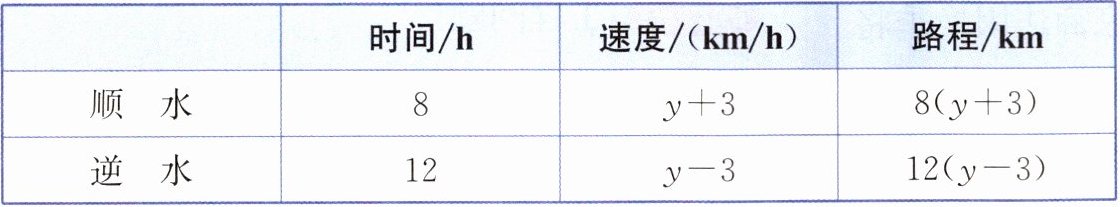 方法二:根据“轮船从甲地顺流行驶到乙地的路程= 轮船从乙地逆流行驶到甲地的路程”,可得方程。设轮船在静水中的速度为$y$km/h,列表如下: