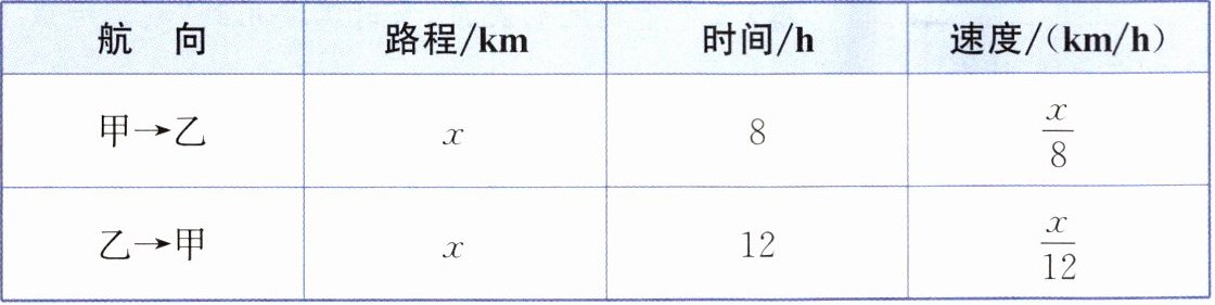 示例4一艘轮船从甲地顺流行驶8h到达乙地,原路返回需12h才能到达甲地。已知水流速度是3km/h,求甲、乙两地之间的路程。