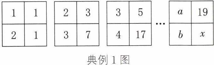 。解析:观察各正方形中的四个数,可以发现:左上角的数是从1开始的连续的正整数,右上角的数是从1开始的连续的奇数,左下角的数是从2开始的连续的正整数,右下角的数是左下角的数与右上角的数之积再减去左上角的数的差。因为最后一个图形的右上角的数$19 = 2×10 - 1$,所以这个图形是第10个图形。所以左上角的数$a = 10$,左下角的数$b = 10 + 1 = 11$。所以右下角的数$= 11×19 - 10 = 199$,即$x$的值为199。