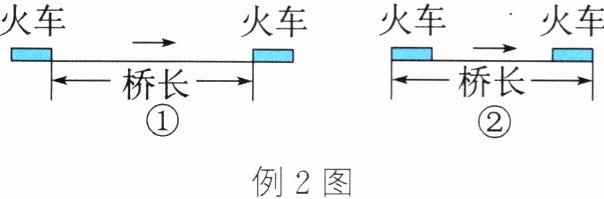 解析:由题意,可知火车的行驶速度和火车的长度是不变的量。“从车头上桥到车尾离桥”所要考虑的路程是桥与火车的长度之和(如图①),而“整列火车完全在桥上”所要考虑的路程是桥与火车的长度之差(如图②)。根据火车的行驶速度不变,列出方程即可求解。