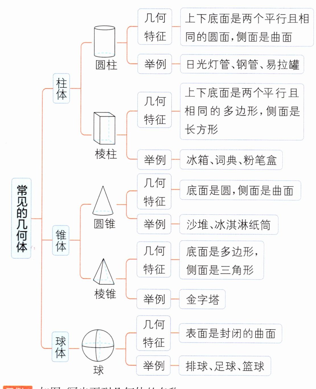 !提示 1. 要通过比较不同几何体之间的共同点和不同点,来学习和掌握不同几何体各自的特征和名称。
