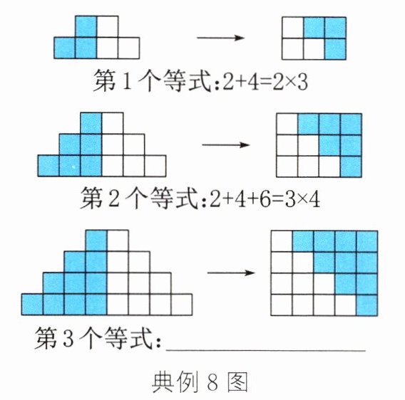 解析:(1)第 3 个图中左边图形中的小正方形的个数可表示为 $2 + 4 + 6 + 8$,右边长方形中的小正方形的个数可表示为 $4×5$. 因为右边长方形是将左边图形中涂色的小正方形移动拼成的,所以第 3 个等式为 $2 + 4 + 6 + 8 = 4×5$. (2)因为第 1 个等式:$2 + 4 = 2×3$,即 $2 + 2×(1 + 1) = (1 + 1)×(1 + 2)$;第 2 个等式:$2 + 4 + 6 = 3×4$,即 $2 + 4 + 2×(2 + 1) = (2 + 1)×(2 + 2)$;第 3 个等式:$2 + 4 + 6 + 8 = 4×5$,即 $2 + 4 + 6 + 2×(3 + 1) = (3 + 1)×(3 + 2)\cdots\cdots$所以第 $n$ 个等式:$2 + 4 + 6 + \cdots + 2(n + 1) = (n + 1)(n + 2)$. (3)结合(2)并根据“左边图形中最底端有 200 个小正方形”可得关于 $n$ 的方程,解之可得 $n$ 的值,并可得左边图形中共有的小正方形的个数.