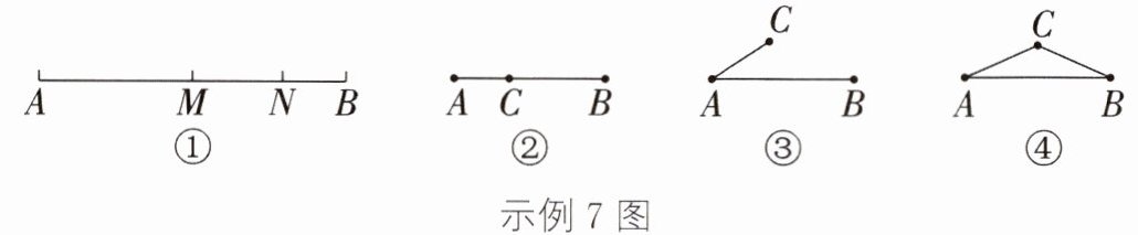 示例7 (1) (苏州期末)已知$ AB = 2a $($ a > 0 $)。给出下列四个条件:①$ AC + BC = 2a $;②$ AB = 2AC $;③$ AC = BC $;④$ AC = BC = a $。其中,能确定$ C $是线段$ AB $的中点的有(