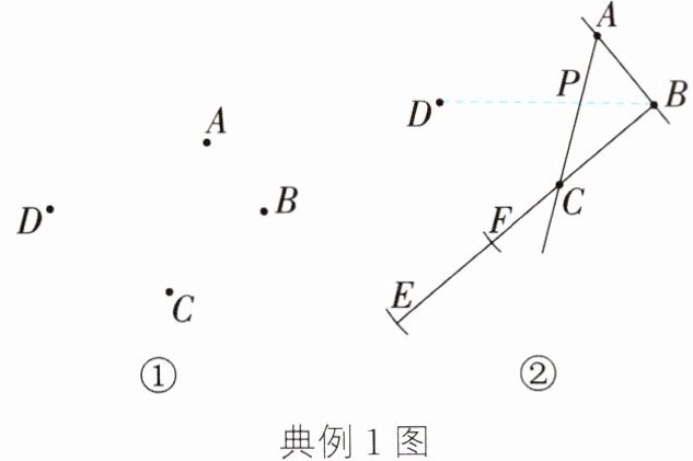 典例1 如图①,已知四点$ A $,$ B $,$ C $,$ D $,请用尺规完成作图(保留作图痕迹)。
