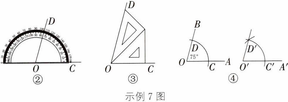 画法二:∠AOB是一个特殊角度的角,可用一副三角尺画出。如图③,∠COD = 75°,所以∠COD就是所要作的等于已知角∠AOB的角。