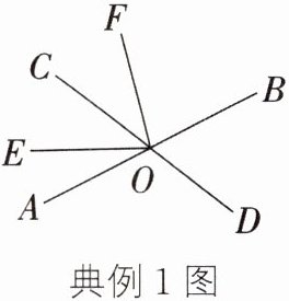 - 典例1:(2022·无锡期末)如图,直线 $AB$ 和 $CD$ 相交于点 $O$,$OE$ 把 $\angle AOC$ 分成两部分,且 $\angle AOE : \angle EOC = 2 : 3$,$OF$ 平分 $\angle BOE$。