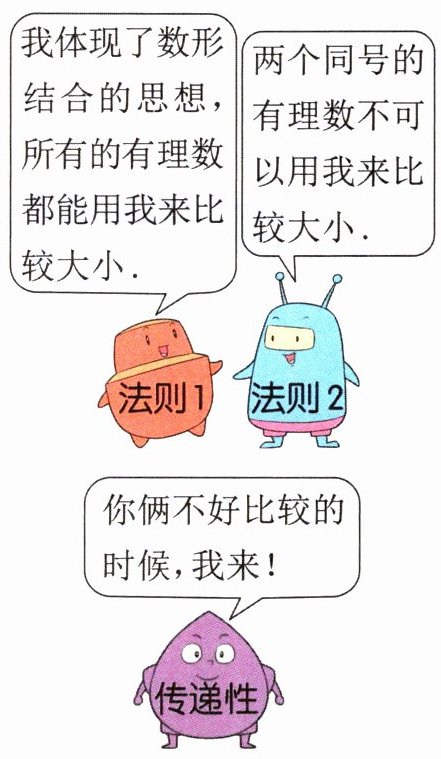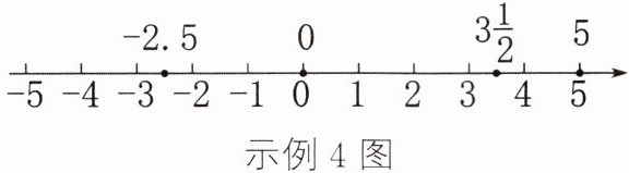 解析:可以先在数轴上找到表示这些数的点的位置,然后用法则 1 进行比较;也可以用法则 2 直接进行比较,容易知道$ 5 > 3\frac{1}{2},$再由法则 2 可知 -2.5 < 0,$0 < 3\frac{1}{2}。$