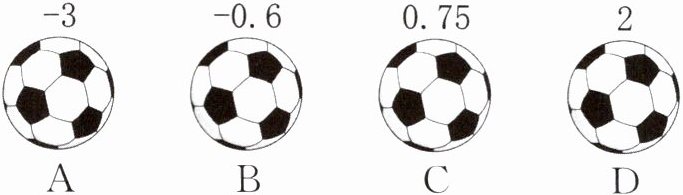**解析**:因为选项中足球质量的数据是以标准质量为基准的,所以从轻重的角度看,数据中绝对值最小的即为最接近标准质量的足球.因为$|-0.6|<|0.75|<|2|<|-3|$,所以最接近标准质量的是选项B的足球.