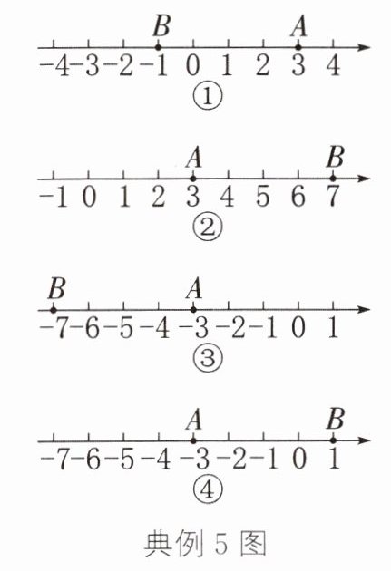 **解析**:因为点A表示的数的绝对值为3,所以点A表示的数是$\pm3$.所以需分情况讨论:① 当点A表示的数是3时,点B可以在点A的左侧(如图①),此时点B表示的数是-1;点B也可以在点A的右侧(如图②),此时点B表示的数是7.② 当点A表示的数是-3时,同理①,可借助图③④分别求出满足条件的点B表示的数是-7,1.综上所述,满足条件的点B表示的数是1或7或-7或-1.