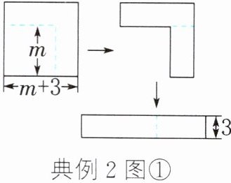 如图①,将边长为 $ m + 3 $ 的正方形纸片剪出一个边长为 $ m $ 的正方形之后,剩余部分又剪拼成一个长方形(不重叠无缝隙). 若拼成的长方形的一边长为 3,则周长为(
