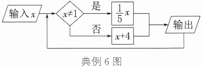 解析:因为 $ 125 \neq 1 $,所以把 $ x = 125 $ 代入代数式 $ \frac{1}{5}x $,即第 1 次输出的结果为 25. 第 2 次输入的数是 25,$ 25 \neq 1 $,所以把 $ x = 25 $ 代入代数式 $ \frac{1}{5}x $,即第 2 次输出的结果为 5. 第 3 次输入的数是 5,$ 5 \neq 1 $,所以把 $ x = 5 $ 代入代数式 $ \frac{1}{5}x $,即第 3 次输出的结果为 1. 第 4 次输入的数是 1,所以把 $ x = 1 $ 代入代数式 $ x + 4 $,即第 4 次输出的结果为 5. 依次可计算出第 5 ~ 8 次输出的结果分别为 1,5,1,5,可以发现输出的结果从第 2 次开始以 5,1 这 2 个数为一组循环. 因为 $ (2023 - 1) ÷ 2 = 1011 $,所以第 2023 次输出的结果与第 3 次一样,为 1.