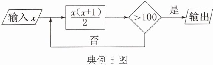 解析:把 $ x = 3 $ 代入程序中的代数式中计算,若结果大于 100,则输出;若小于或等于 100,则把此结果作为 $ x $ 的值重新代入计算,如此循环计算,直到计算结果大于 100,才能作为输出结果. 把 $ x = 3 $ 代入程序计算,可得 $ \frac{x(x + 1)}{2} = \frac{3 × (3 + 1)}{2} = 6 $. 因为 $ 6 < 100 $,不符合输出要求“> 100”,所以不能输出. 把 $ x = 6 $ 代入程序计算,可得 $ \frac{x(x + 1)}{2} = \frac{6 × (6 + 1)}{2} = 21 $. 因为 $ 21 < 100 $,不符合输出要求“> 100”,所以不能输出. 继续把 $ x = 21 $ 代入程序计算,可得 $ \frac{x(x + 1)}{2} = \frac{21 × (21 + 1)}{2} = 231 $. 因为 $ 231 > 100 $,符合输出要求,所以能够输出.