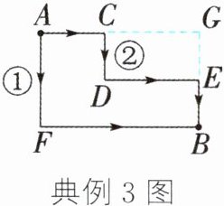 理由:通过平移,路径①的长度为AF+FB,路径②的长度为AC+CD+DE+EB。由平移性质可知,AF=CD+DE,FB=AC+EB,故路径①和路径②的长度均等于长方形的一条长与一条宽之和,因此两条路径长度相等。