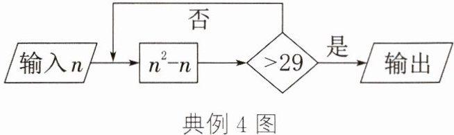 解析:当 $n = -3$ 时,$n^{2} - n = (-3)^{2} - (-3) = 9 + 3 = 12$. 因为 $12 < 29$,不满足输出条件,所以需把计算结果 12 作为输入 $n$ 的值重新计算. 当 $n = 12$ 时,$n^{2} - n = 12^{2} - 12 = 144 - 12 = 132$. 因为 $132 > 29$,满足输出条件,所以最后输出的结果是 132.