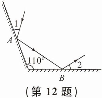 12. 如下图,平面镜A、B之间的夹角是110°,光线经平面镜A反射到平面镜B上,再反射出去。若∠1= ∠2,则∠1的度数为( )。