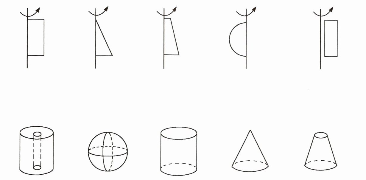 1. 把下面的平面图形围绕所示的轴旋转,会得到一个什么样的立体图形?连一连。