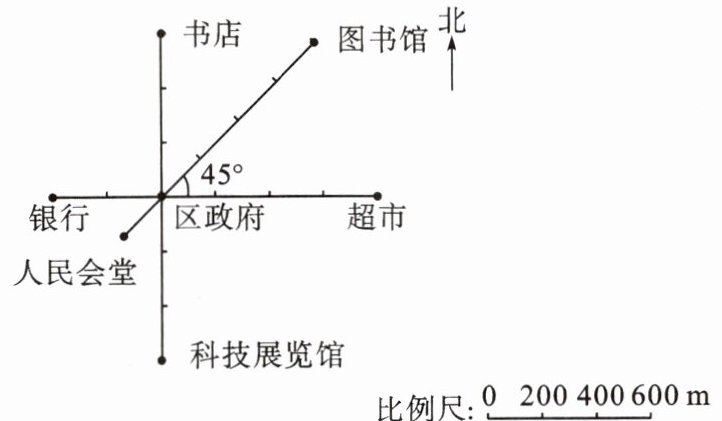 (3)图书馆在区政府( )偏( )( )°方向( )米处。