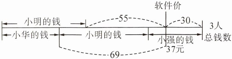例2 小明、小华、小强三人想合买一个电脑软件。如果用小明带的钱去买,还差55元;如果用小华带的钱去买,还差69元;如果用三人带着的钱去买,就多了30元。已知小强带了37元,问这个软件多少元?